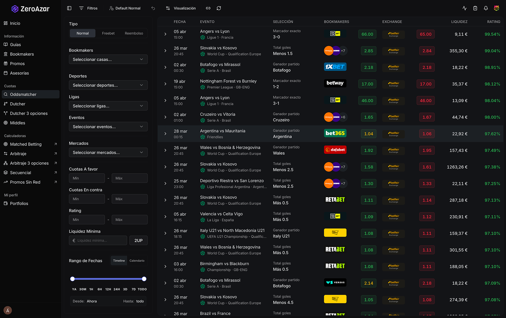Buscar el lay perfecto a mano puede llevar 20 minutos. El Oddsmatcher lo hace en segundos — cruza todos los mercados, calcula el profit neto y te da el par listo para ejecutar.